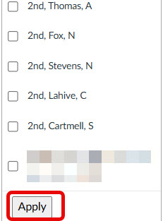 IMPORTANT: A Canvas update (late Sept 2025) has changed how sections display in the dropdown list. This means users now need to click on the checkbox next to a makers name to select it and scroll to the bottom of the list and click the Apply button to filter SpeedGrader.