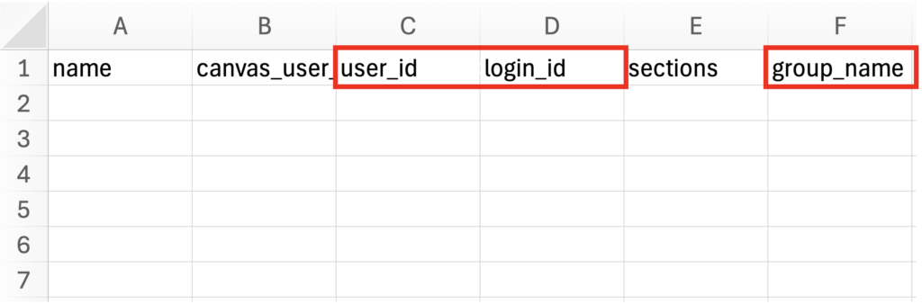 Filling in the other columns of the Canvas Course Roster CSV (Image 1) is not necessary. In the downloadable template (Image 2) only the 3 main columns have been included, but as before, only user_id or login_id is required in addition to group_name.