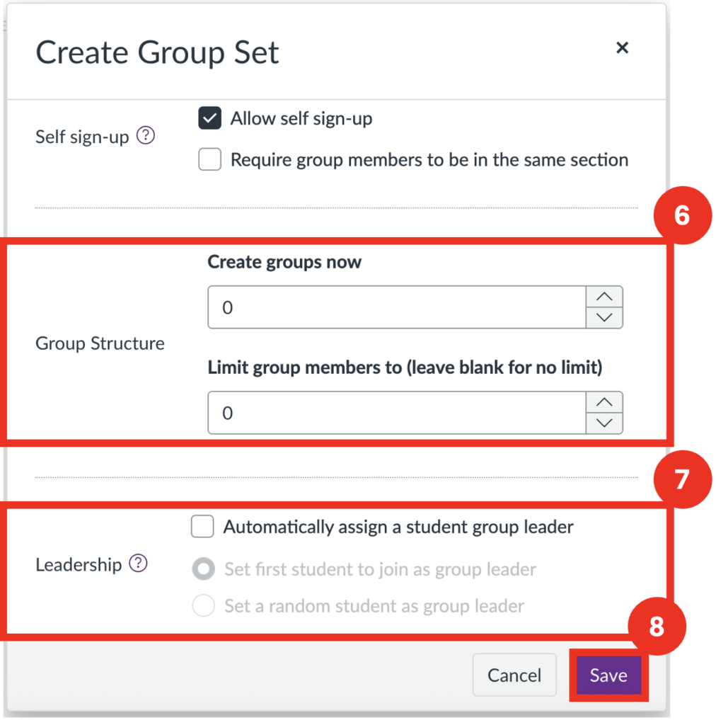 Step 7: There will be an option to “Automatically assign a group leader”. A group leader will be able to change the name of their group and add/remove group members. If left unchecked no group leader will be assigned.