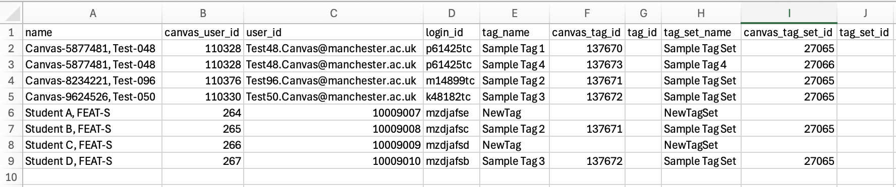 To add one or more students to an existing tag, copy the tag and tag set information into the relevant rows. In this example, Student B is to be added to Sample Tag 2, and Student D is to be added to Sample Tag 3.