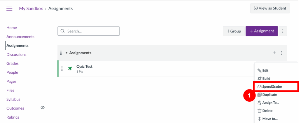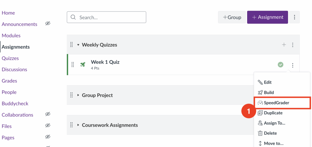 Step 1: Click the 3 dots to the right-hand side of your quiz and select Speedgrader.