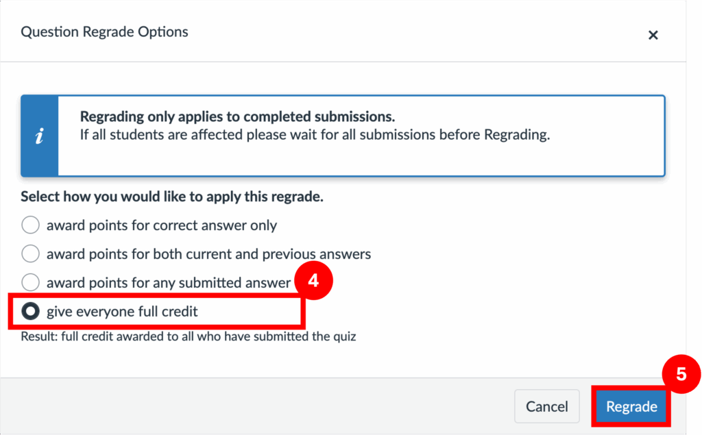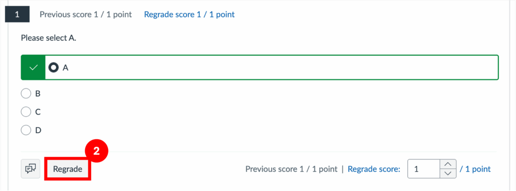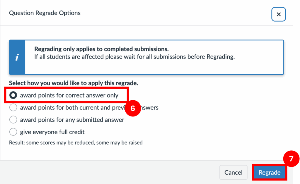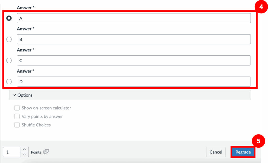 - Option 2: I need to change the correct answer or the point values.If you need to adjust the point value (for the entire question or for individual answer options) or update the correct answer (for example, if option A was marked correct when it should have been B), you can use the Regrade function. If students have already received grades, it is important to alert them to this change, in order to avoid any confusion when their grade changes.