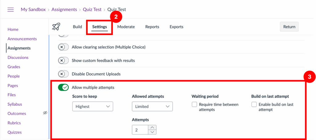 Step 2: To give an additional attempt to all students, enter quiz Settings and scroll down to Allow multiple attempts.
