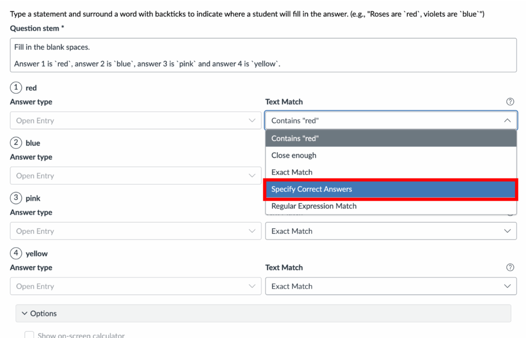 If editing a Fill in the Blank question, the process requires a few additional steps. Follow the process above, but after Step 3, once you have identified the question to be amended, change the Text Match setting to Specify Correct Answers. Enter the correct answer, then change Text Match back to your desired setting. Follow steps 5-7 as above to complete the regrading.
