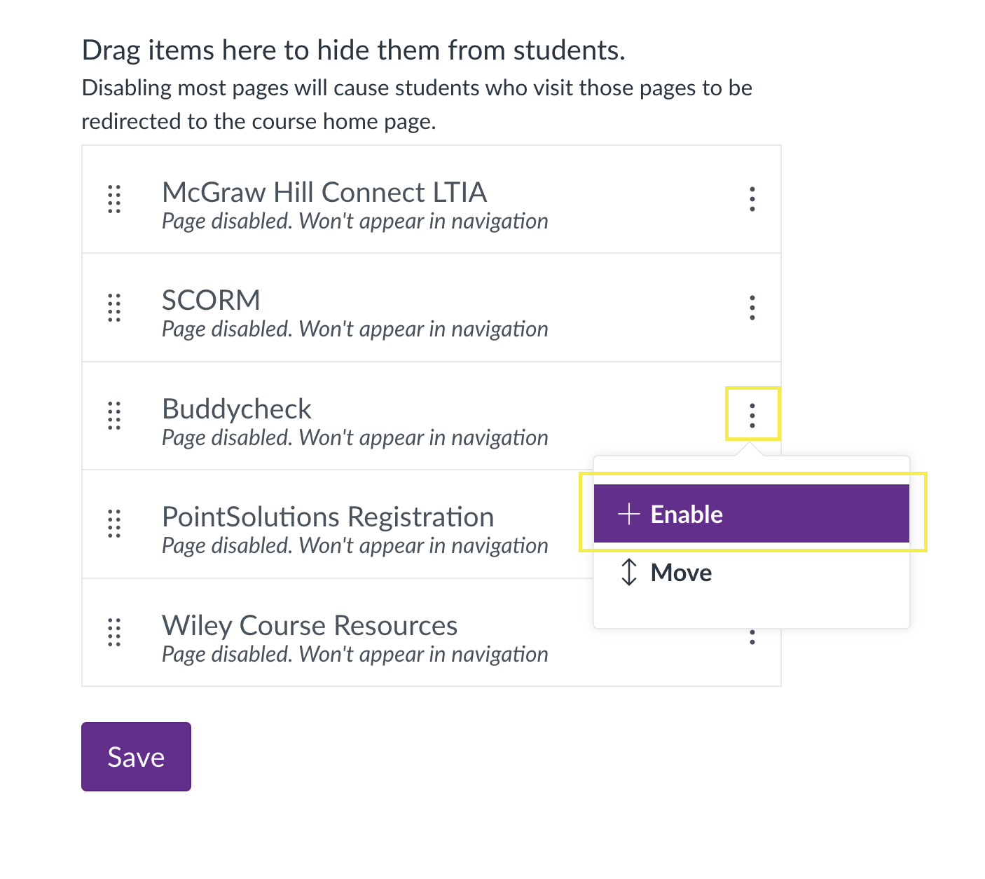 Click the three-dot icon to the right of the Buddycheck item and select Enable. Alternatively, you can select the 8-dot icon and drag and drop the item into the active course menu items area.