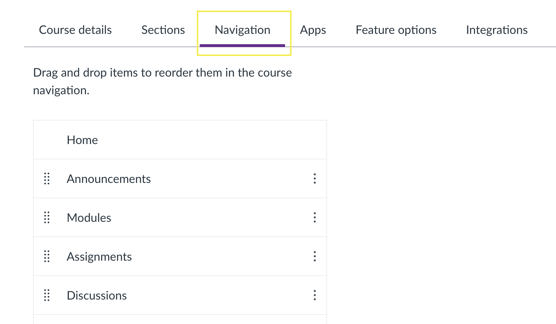 Select the Navigation tab at the top. The Navigation settings page allows you to enable/disable course menu items to show/hide them from student view. You can also re-order menu items by dragging and dropping them into the desired position.