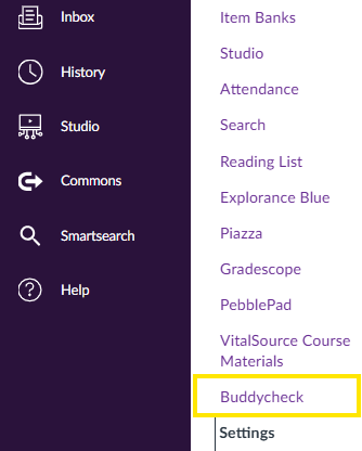 Students access Buddycheck within a Canvas course by clicking on the Buddycheck link within the course menu.