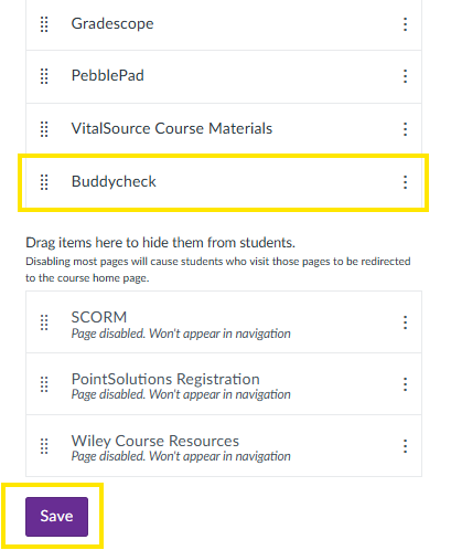 When you are happy with the position of your Buddycheck menu item, click Save to save you amendments. You should now see a Buddycheck link in your Course Menu.