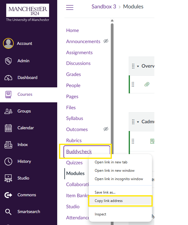 To do this, right click on the Buddycheck course link, and select Copy link address.
