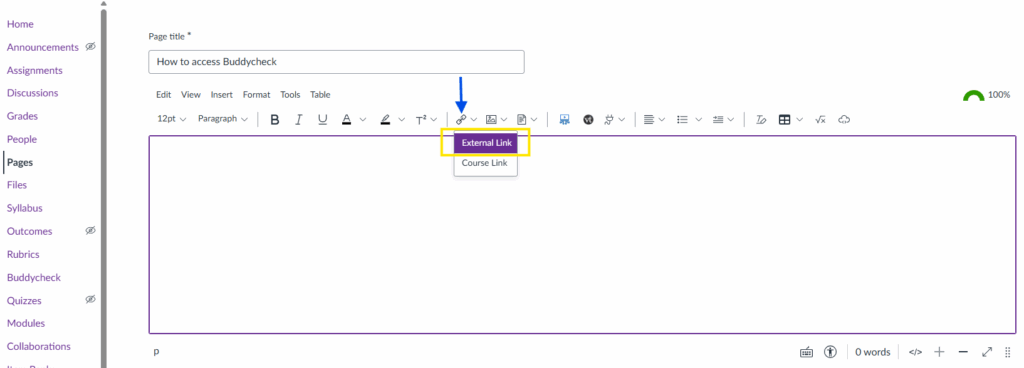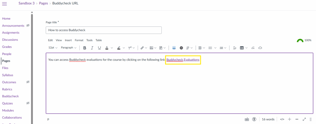 You should now have a Buddycheck link within your Canvas page. You may wish to add some supporting or guidance text to add some context to the link. Remember to click on Save to save the changes that you have made to your Canvas page.