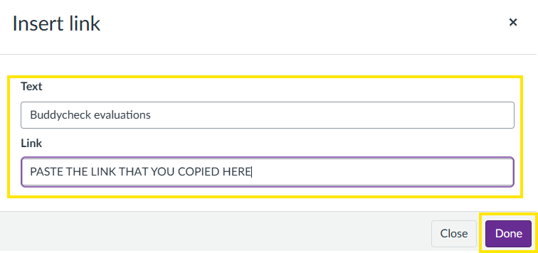 In the pop-up box that appears, give your link a name, paste the Buddycheck link that you copied, click ‘Done’ to embed the link.