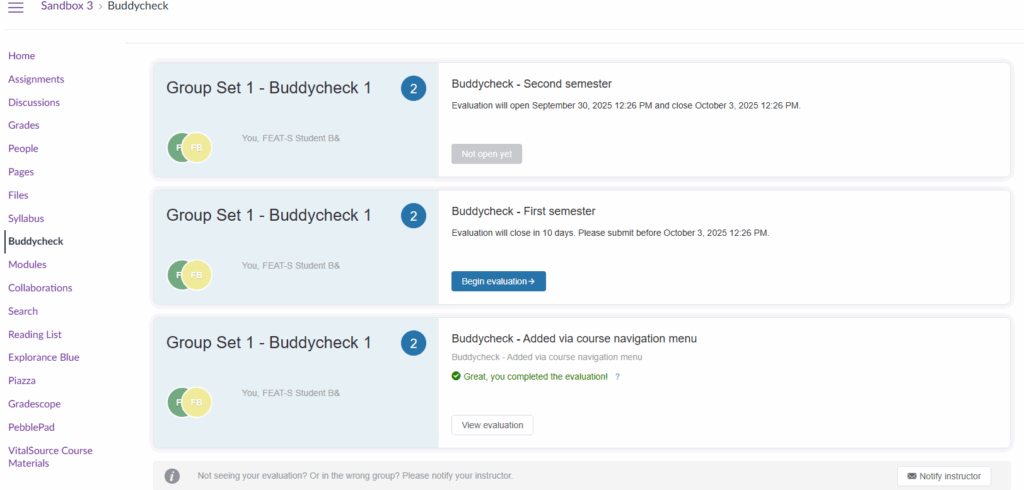 Upon clicking the Buddycheck link, students will be presented with a list of Buddycheck peer evaluations associated with the course.
