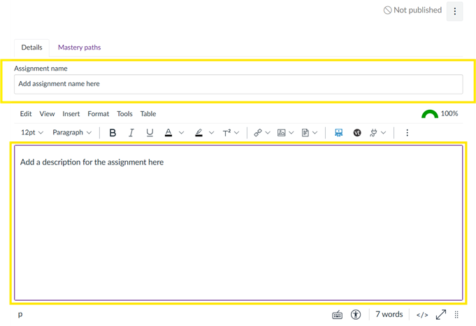 Assignment name and description. Enter an assignment name and add a description in the box below the assignment name: