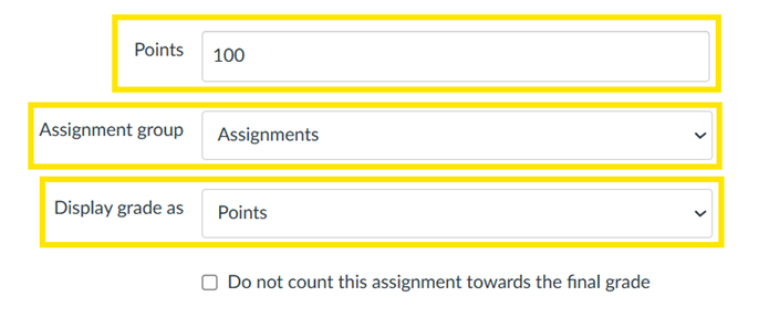 Display grade as. Leave as points or change to percentage, whichever you prefer. Alternatively, if this is an ungraded assignment then select ‘Not Graded’ from the drop-down menu: