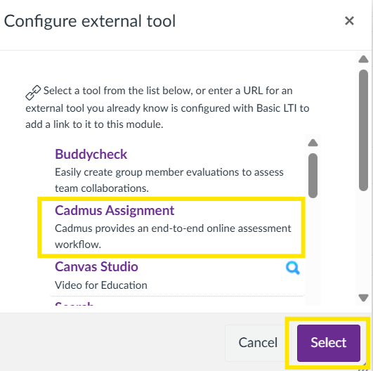 Locate and select ‘Cadmus Assignment’ from the list, and then click on the ‘Select’ button:
