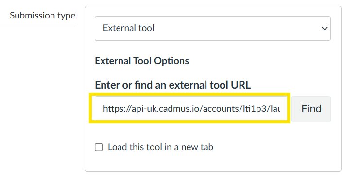 Find Cadmus. Within the same ‘Submission type’ box, click on the ‘Find’ button to open the list of external tools: