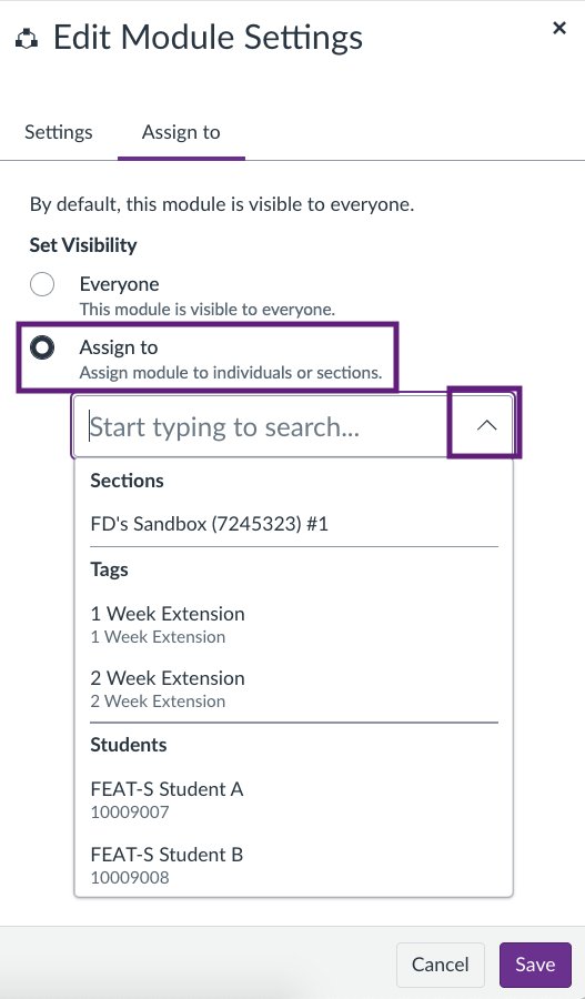 Select the Tag(s) you wish to assign this Module to. You can also type the name of a student to assign the Module to them specifically, as shown below.