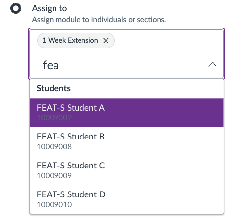It is possible to release certain course content to specific students or sets of students. This is done using the ‘Assign to‘ function. You can use this feature for an entire Module or for particular items within a Module.