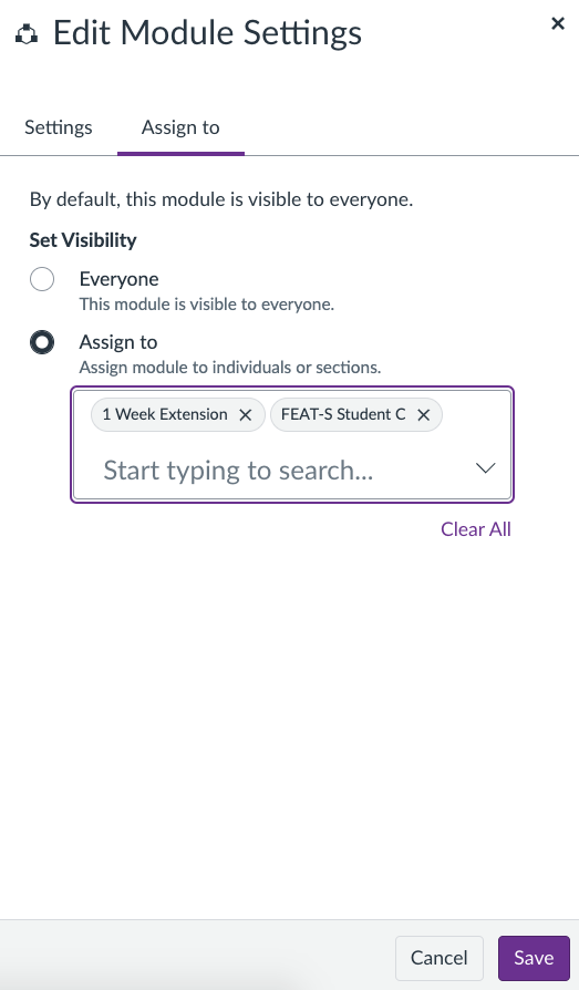 Select the ‘Assign to‘ tab. You will see that, by default, the Module is visible to everyone enrolled in the course.