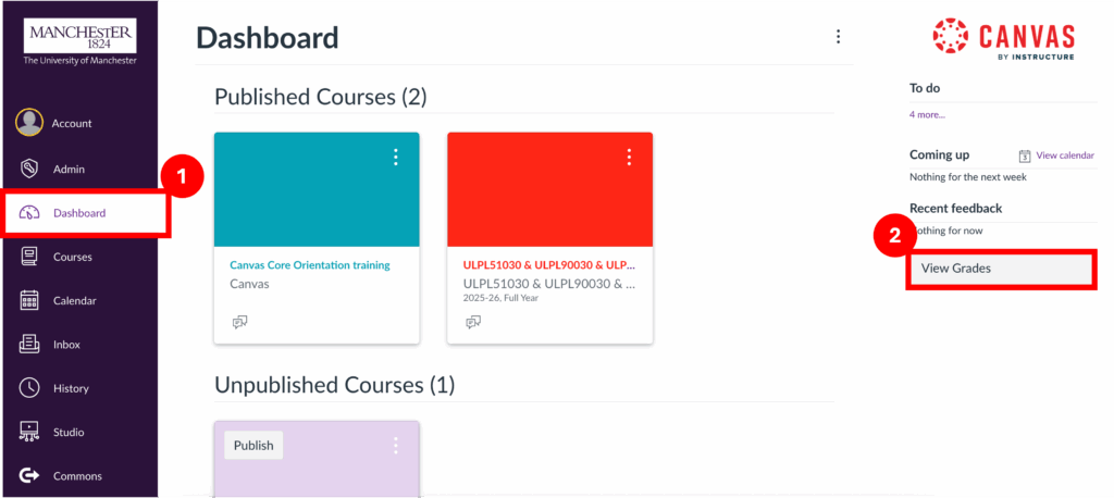You can view your grades and feedback in two ways: by accessing each individual course to see a detailed breakdown for every quiz and assignment, or by viewing a summary across all your courses, which displays the current average grade for each one.